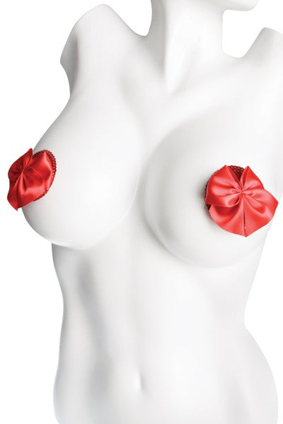 1 Pair. Round sequin pasties with satin bow and reusable self adhesive backing