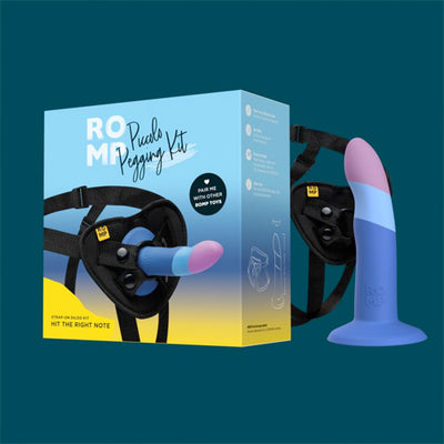 ROMP Piccolo Pegging Kit includes a non-realistic silicone dildo and an adjustable harness for both beginners and seasoned explorers in pegging play. With a 5-inch curved shaft and flared base, the Piccolo dildo is designed for g-spot, p-spot and double penetration. Plus, it can fit the ROMP Riot bullet vibrator for an added thrill to remember. Take the ride of a lifetime with Piccolo Pegging Kit!